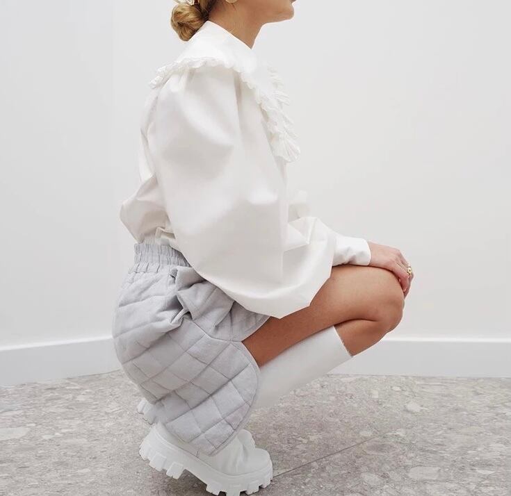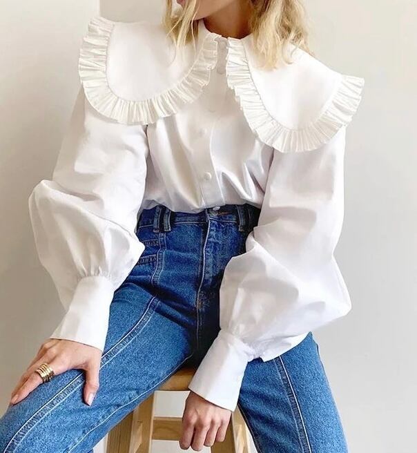 ラペルのフリルで甘さをプラス。袖のシルエットはバルーンシルエットで袖口がキュッとしまったデザインです。すこし袖をまくると素敵なボリュームでこなれた感じに。くるみボタン仕上げでディテールにもこだわり仕上げだ高見えブラウスです。ニットベストやワンピース、パンツに合わせやすいシックなカラー展開。